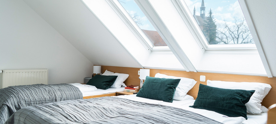 These bedrooms have one double bed and one single bed accommodating 3 people in a maisonette (loft-style) form. It is on 2 levels connected with in-room stairs. The upper level is the bedroom and has a slanted ceiling and window facing the inner hotel courtyard. The lower level contains the bathroom and a nice sitting area where you can refresh yourself or simply just relax after an eventful day.